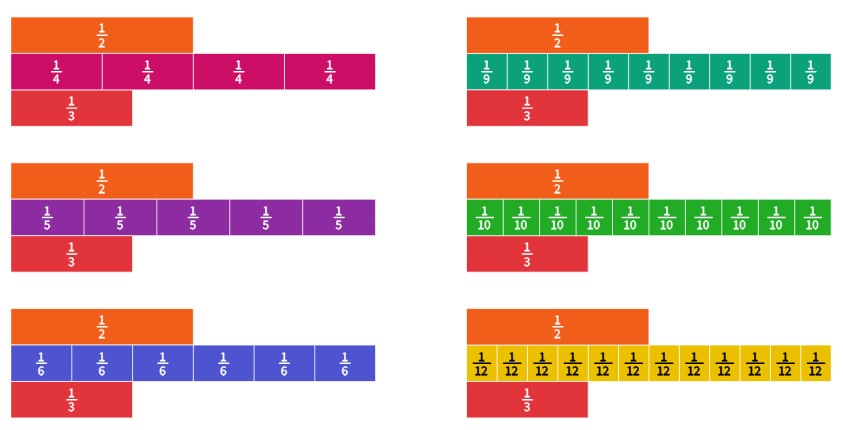 Perhaps your school does not have access to fraction tiles/bars. We can also find a common denominator using C-strips. Again, it comes down to multiples.