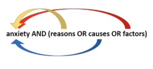Let us say you want to search for information about the causes of anxiety. After brainstorming synonyms for your keyword “causes,” you come up with “reasons” and “factors.” Databases may use different terminology to talk about the same subject. Instead of performing three separate searches for anxiety with each term, you can instead use Boolean operator OR to search them all at once. Without parentheses, the search “anxiety AND reasons OR causes OR factors” would find sources containing “anxiety AND reasons,” or sources containing “causes” or “factors” without necessarily containing anything about anxiety. This will bring you way too many results, many of which will be irrelevant. To fix this search to find what you actually want, use nesting.